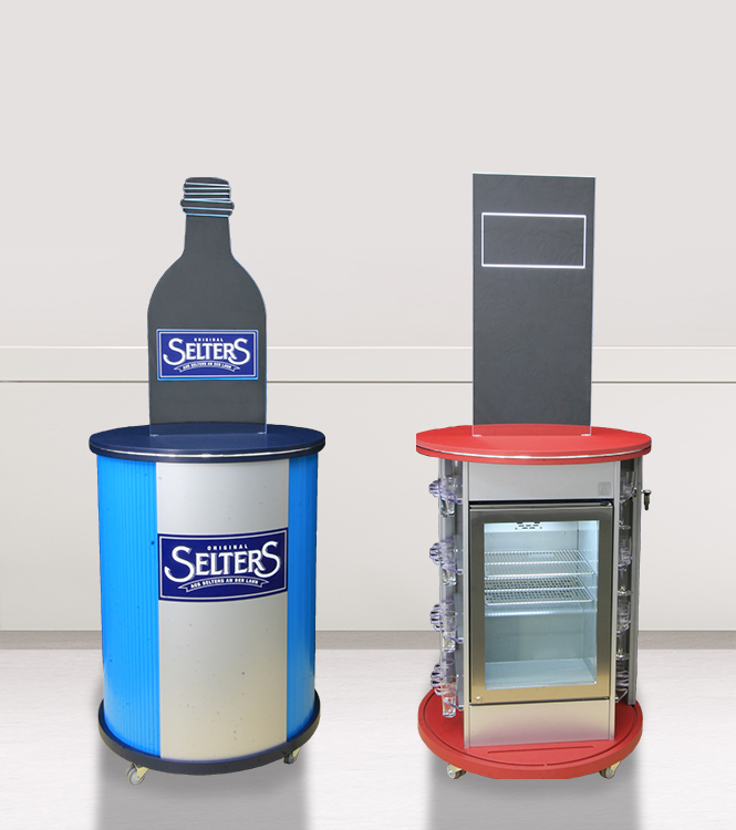 Der ISI-COOLER ist eine Kombieinheit aus Edelstahlkühlschrank und Gläserreservoir, umgeben von einer rundum verschließbaren Lamellenhülle, die das Element optisch prägt. Der COOLER wird mit Transporteinheit steckerfertig angeliefert, ist vor Ort ohne Aufbauzeit sofort einsetzbar und durch Rollen jederzeit mobil. Der schlanke Korpus mit seinen 75 cm Durchmesser und 110 cm Höhe ist nach Wunsch lackierfähig und durch ein Display- Adaptersystem wird er einfach und schnell zum schicken Werbeträger.