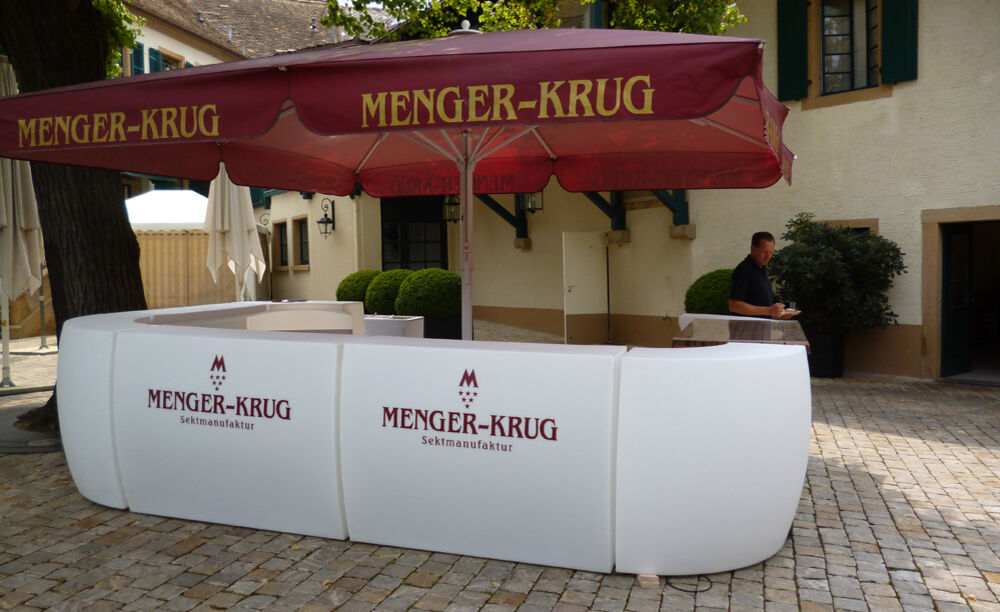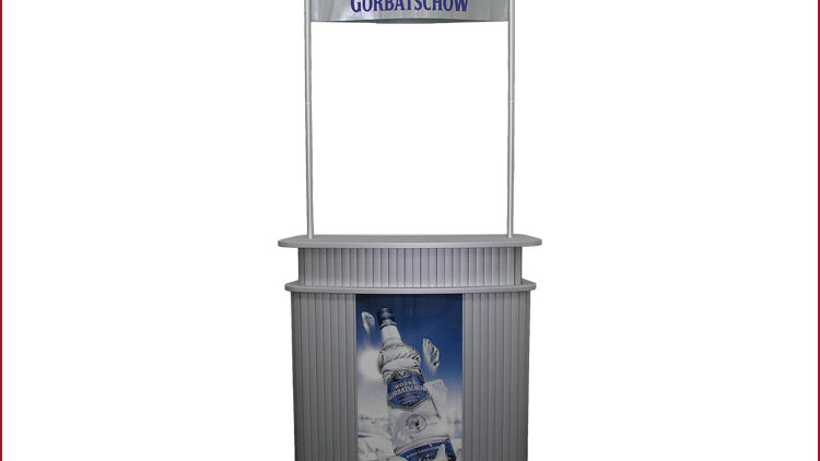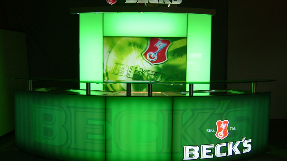 Mobiles Thekenset mit integriertem Ausschankkonzept sowie Rückwand für Promotion-Veranstaltungen