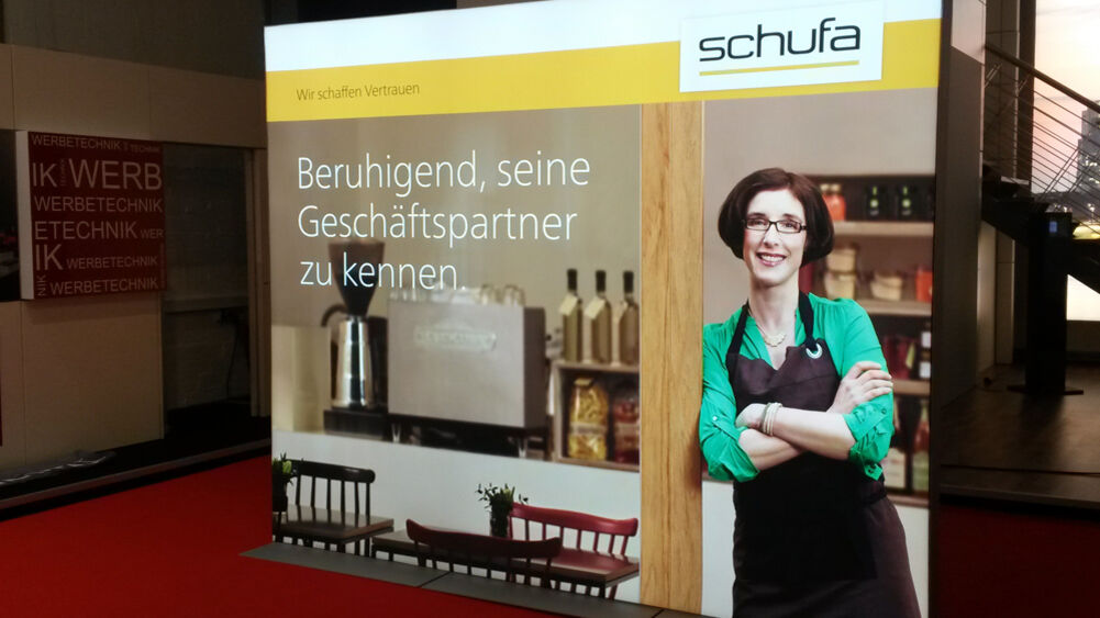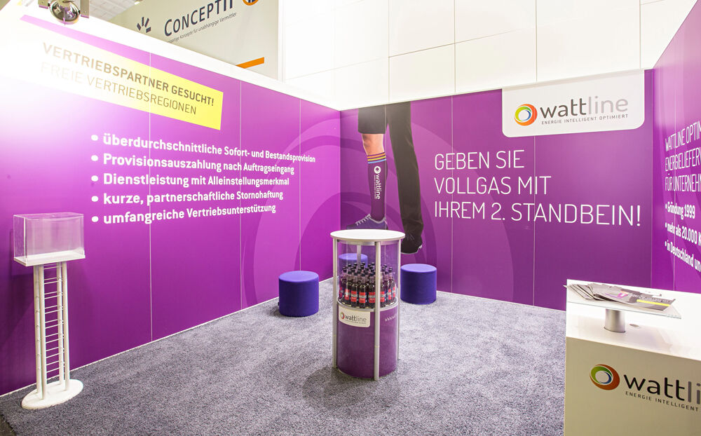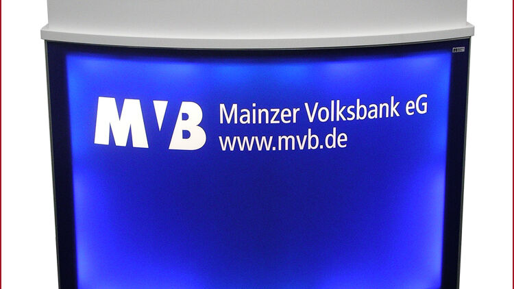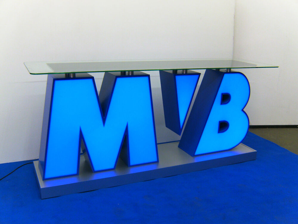 Die Thekenanlage besticht durch eine Grundausstattung, die durch Wechselmotive in Thekenfront und Rückwand sowie variable Lichttechnik für alle Produkte des Unternehmens nutzbar ist. Grün, Blau, Gelb und Rot auf Knopfdruck.