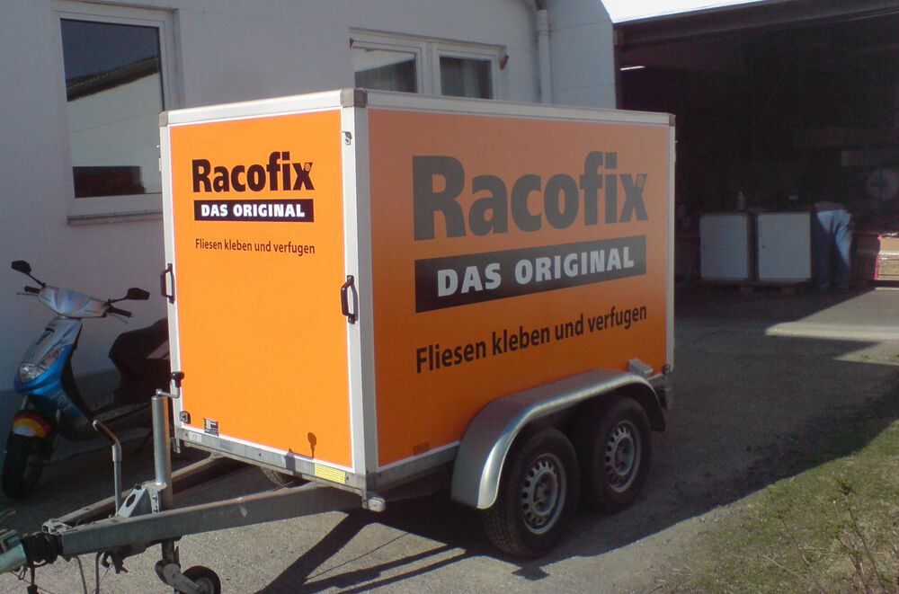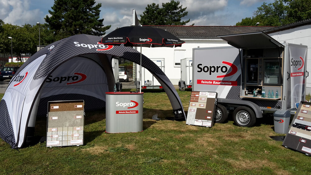 7 Pkw-Anhängern für eine deutschlandweite Promotiontour der Sopro Bauchemie GmbH für rund 250 Endkunden-Veranstaltungen