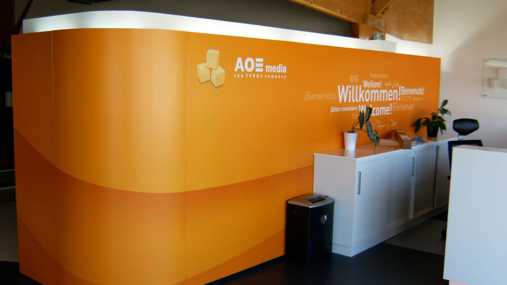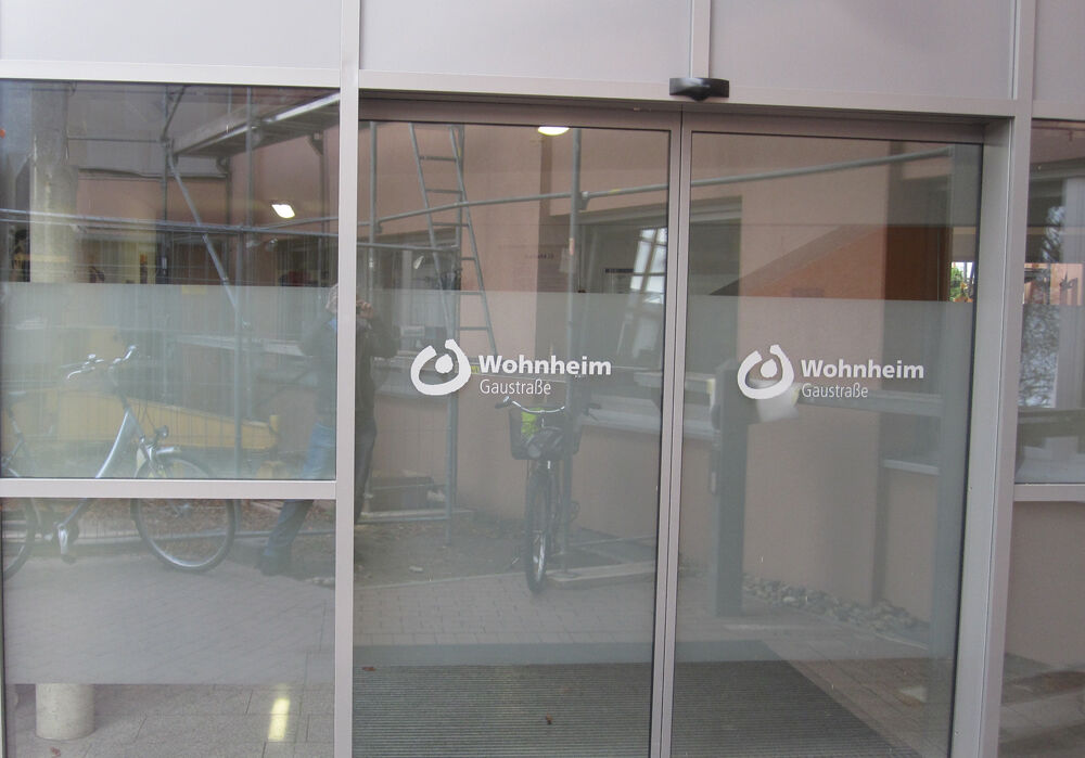 Außenbeschilderung mit Glasdekorfolien, Digitaldruck und LED-Lichttechnik. Im Innenbereich zwei großflächige Bildmotive.