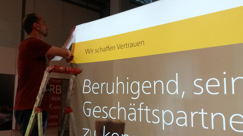 in 25m Höhe wurden drei Logos und ein 9,50m breiter Schriftzug der Firma befestigt