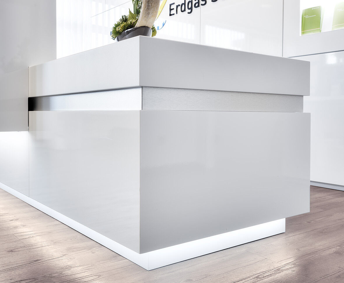 Untere Front der Empfangstheke mittels hochwertiger Lichttechnik effektvoll unterleuchtet, überzeugt durch klares Design, Rückwand aus ISIDesign Trennwandsystem mit flächenbündig eingelassenem Monitor, höhenverstellbarer Arbeitsbereich